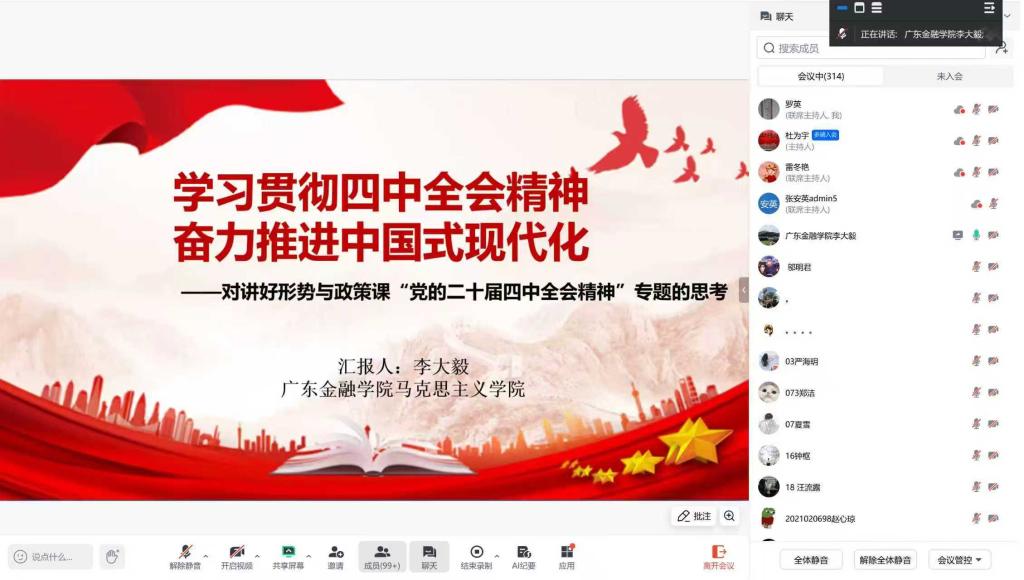 为贯彻落实党的二十届四中全会精神,讲好形势与政策课党的二十届四中全会精神专题,2025年11月8日,马克思主义学院联合成都工业学院、成都大学、成都信息工程大学、中国民航大学等高校的马克思主义学院,以形势与政策虚拟教研室为平台,共同开展党的二十届四中全会精神专题云端集体备课会,省内外高校100余位教师参加此次备课会。会上,我校形势与政策教研室骨干教师李大毅老师以《学习贯彻四中全会精神,奋力推进中国式现代化》,分享了对讲好形势与政策课“党的二十届四中全会精神”专题的思考,获得了点评专家同与会人员的认可。